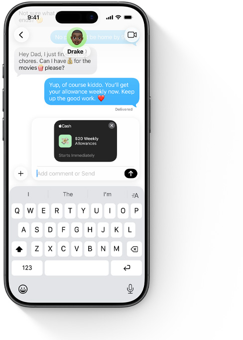 With Apple Cash Family, you can set up Apple Cash for anyone in your family under 18. Easily and securely send money for allowance, shopping, or just because. Even set up recurring payments to keep allowances on a schedule. The funds go right to their own Apple Cash card in Wallet, ready to spend with Apple Pay. Or they can transfer the money to their bank account to save for the future. You can view your child’s balance and activity at any time. You can apply certain restrictions to their account. It’s the perfect amount of financial freedom for a child — with built-in protections for your peace of?mind.