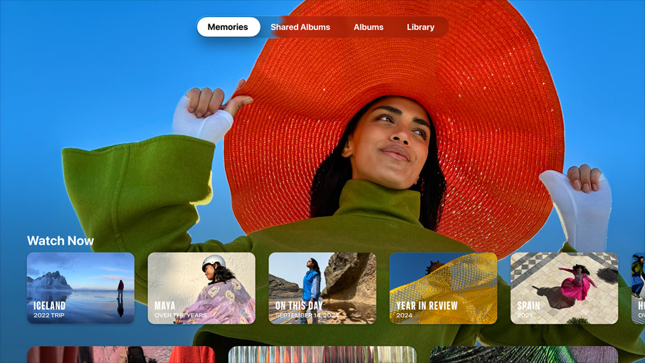 Photos. iCloud Shared Photo Library makes it easier than ever for the whole family to enjoy each other’s photos, and you can see them all right on your TV. And you can choose Memories as your screen saver and watch your special moments come alive on the big?screen.