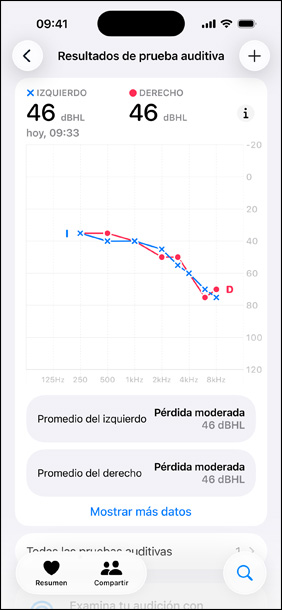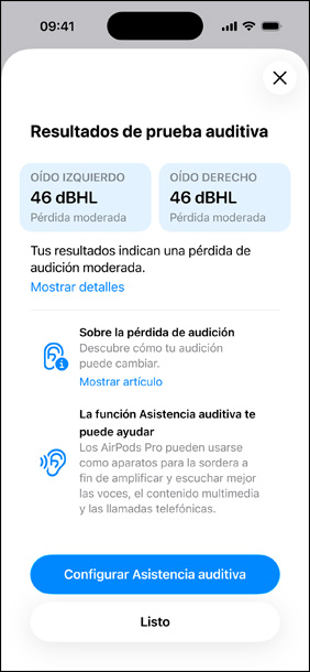 Resultados al instante. Soluciones a mano. Una vez finalizada la?prueba, verás un perfil personalizado con los resultados e información sobre tu audición, todo en términos fáciles de comprender. Si no tienes pérdida auditiva o si la que tienes no es significativa, pero aún así te serviría escuchar algunas frecuencias con mayor claridad, puedes configurar Asistencia para Contenido y ajustar el audio en contenidos multimedia y llamadas. Y si has notado una pérdida auditiva de leve a moderada, se te indicará que configures la funcionalidad Asistencia?Auditiva.
