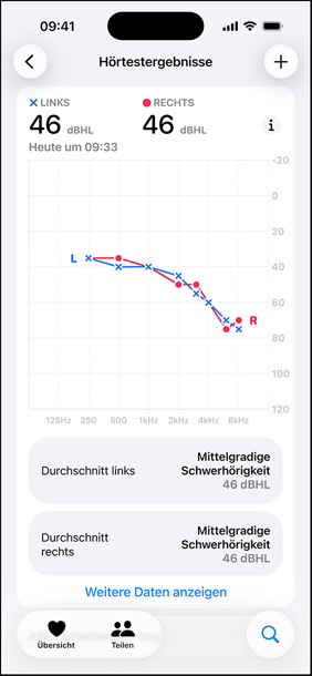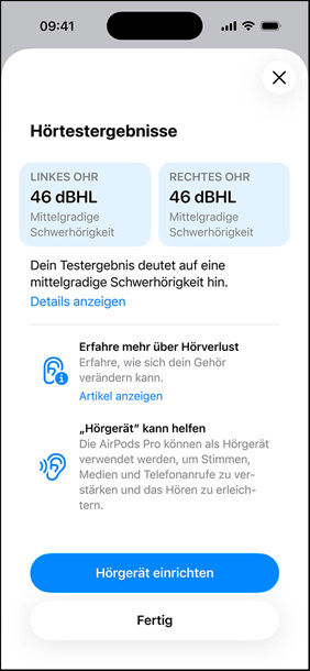 Direkte Ergebnisse. Direkte?Hilfe. Wenn du den Test abgeschlossen hast, siehst du ein personalisiertes Profil mit leicht verst?nd-lichen Ergebnissen und Informationen über dein Geh?r. Auch wenn dein H?r-verm?gen kaum bis gar nicht eingeschr?nkt ist, kannst du dennoch davon profitieren, bestimmte Frequenzen klarer zu h?ren. Darum lassen sich deine Einstellungen für die Medien-unterstützung so anpassen, dass du ein noch besseres Klang-bild beim Anh?ren von Medien und bei Anrufen bekommst. Und falls dein H?r-verm?gen leicht bis mittelstark eingeschr?nkt sein sollte, bekommst du die Empfehlung, die H?rger?t-funktion einzurichten.