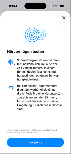 Wenn du einen Ton h?rst, tippst du auf den Bild-schirm. Mithilfe von Reinton-audiometrie, die auf den neuesten Erkenntnissen aus der Akustik basiert, spielt der Test eine Reihe von T?nen ab. Du reagierst darauf, indem du auf das Display tippst. Hilfreiche Animationen, Tapback-Effekte und Fortschritts-anzeigen führen dich durch den etwa 5?minütigen Test. über 150.000?reale Audio-gramme und Millionen von Simulationen haben bei der Entwicklung dieses akkuraten, schnellen und einfachen H?rtests geholfen.