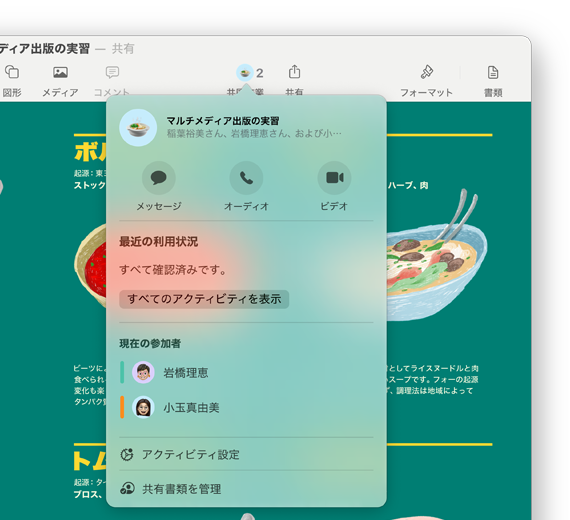 ファイル、フォルダ、書類などを使って共同作業(yè)を進(jìn)めたり、それらのデータを共有することが外出先でも簡(jiǎn)単になります。あなたは特定の人のみがアクセスできるリンクを送り、データを表示、共有、編集できるメンバーを管理するだけ。ほかの人から編集が追加されるたびに、リアルタイムチェックすることもできます。