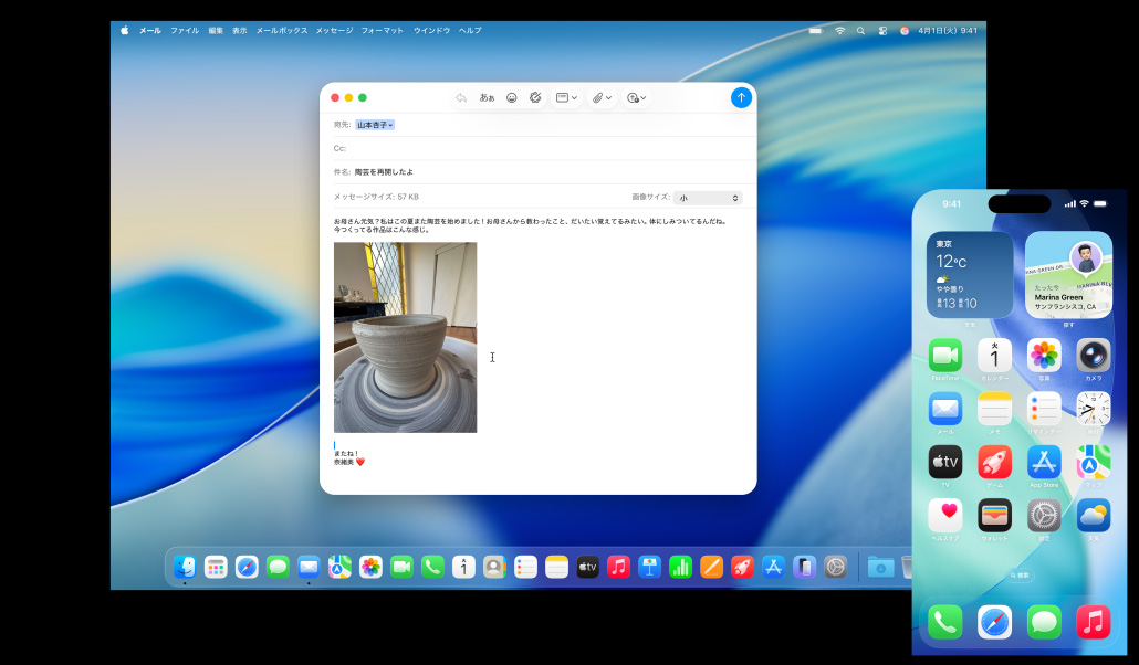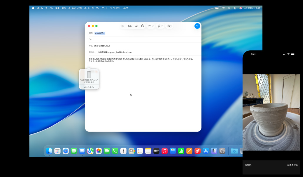 iPhone 16 Plus上で開(kāi)かれたカメラアプリ。陶器の鉢の寫真をフレーミングしている。13インチMacBook Airではメールアプリを開(kāi)いて下書きを作成していて、そこにiPhoneで撮影した畫像が表示されている