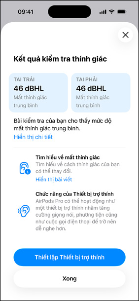 Nh?n k?t qu? ngay. Ti?p c?n h? tr? t?c thì. Khi hoàn t?t bài ki?m tra, b?n s? th?y m?t h? s? ???c cá nhan hóa(chǎn) kèm các k?t qu? d? hi?u và th?ng tin chuyên sau v? kh? n?ng nghe c?a b?n. N?u b?n m?t thính giác nh? ho?c kh?ng g?p v?n ?? gì, nh?ng v?n c?n nghe m?t s? t?n s? r? ràng h?n, b?n có th? ?i?u ch?nh cài ??t H? Tr? Ph??ng Ti?n ?? c?i thi?n am thanh cho n?i dung phát và cu?c g?i. Và n?u b?n có tình tr?ng m?t thính giác t? m?c nh? ??n trung bình, b?n s? ???c nh?c thi?t l?p tính n?ng Thi?t B? Tr??Thính.
